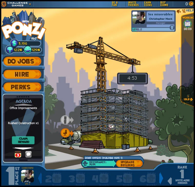 - Любителям возводить небоскребы и к тому же прокачивать скилы придется по душе Ponzi (фейсбук). Каждые сутки в ней тусуется тысяча прорабов. Знакомых френдов, кстати, в Ponzi можно нанимать в качестве строителей!
