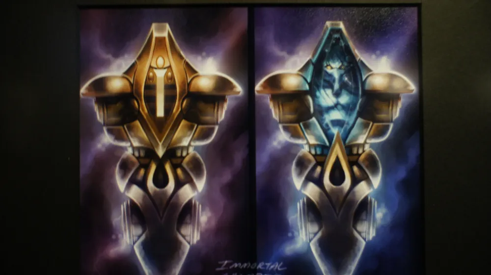 Все арты на стене знакомы, кроме нижнего правого -Зератул держит что-то в руках на фоне какой-то пустыни. Если приглядеться... то какого-то другого Протосса.