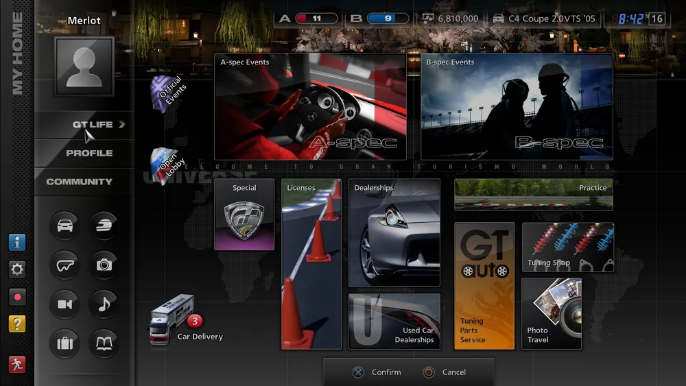 My Home предложит вам на выбор три режима: GT LIFE, Profiles и Community. На показе Polyphony Digital, в первую очередь, выделили элемент Community. Kazunori пояснил, что главнейшей особенностью комьюнити элемента является возможность общаться и соревноваться с вашими друзьями в PSN, для этого в GT5 встроено много способов для общения. Возможность делиться фотографиями и пользовательскими трассами, писать письма, и даже электронная доска объявлений(BBS) будет включена в Community секцию GT5. Эти функции также будут доступны через окно браузера на сайте Gran-Turismo.com. Также среди "плюшек" значится возможность дарить машины или детали своим друзьям по PSN.