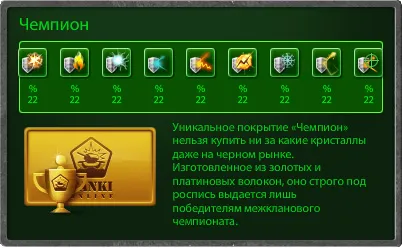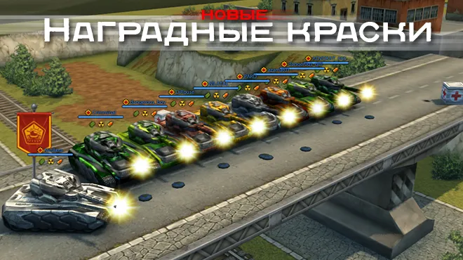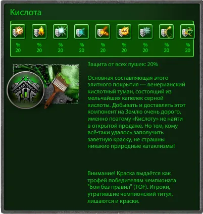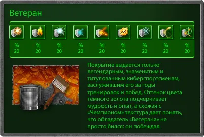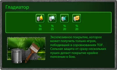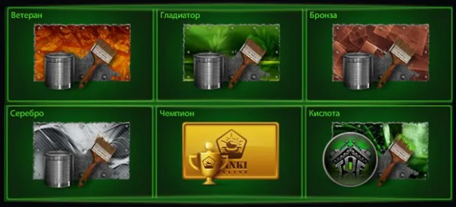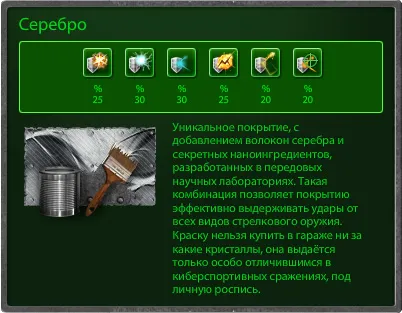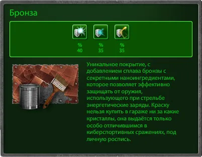 Совсем недавно, с обновлением № 163, в игру, помимо давно известных покрытий «Чемпион» и «Кислота», были добавлены 4 новые краски: «Ветеран», «Гладиатор», «Бронза» и «Серебро».