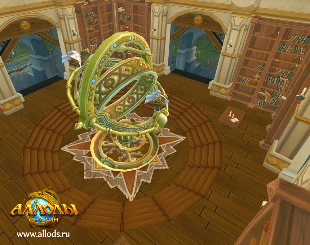 выглядит как гироскопт - устройство, способное измерять изменение углов ориентации связанного с ним тела относительно инерциальной системы координат. зачем он в библиотеке? смотреть на сколько повернулась библиотека в пространстве? хотя если он постоянно вращается, то он должен показывать изменение положения всего аллода в астрале