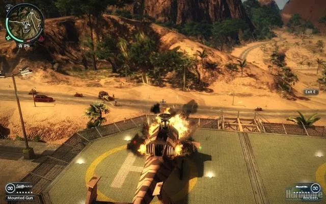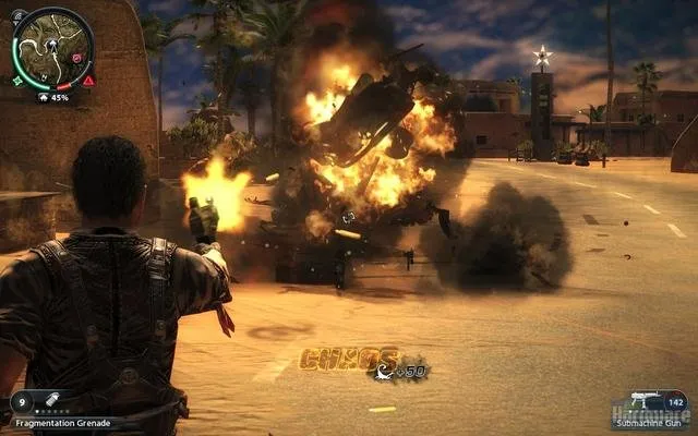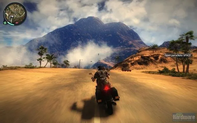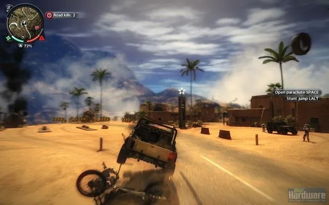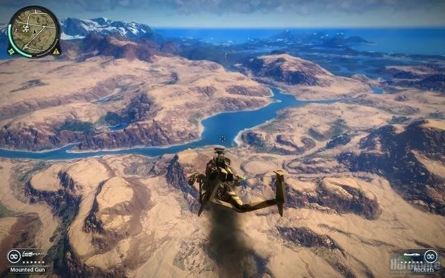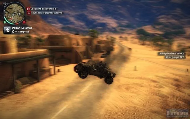 Мир просто огромен, даже та территория что в демке. Огромное количество фана, трюков, вариантов экшна. Фактически развлекать себя можно самому - идеальный сандбокс. Крюк и бесконечный парашут не дают заскучать в долгих передвижениях. Чего только стоит разгромить армейскую базу, завалить 100метровую антенну, угнать вертолёт, вылезти в воздухе из кабины, прицепившись крюком за днище расстрелять стрелка на другом вертолете, спрыгнуть с парашютом, крюком прикрепится к другому вертолету, выбросить пилота, расстрелять с него еще одну армейскую базу, спрыгнуть на землю, угнать бтр, догромить оставшееся, разогнаться, вылезти на крышу, расстрелять преследование, спрыгнуть с утёса, перепрыгнуть на мотоцикл... Это первых минуты три. Демка ограничена 30минутами, но это хорошо. Кстати время добавляют за миссии и трюки.