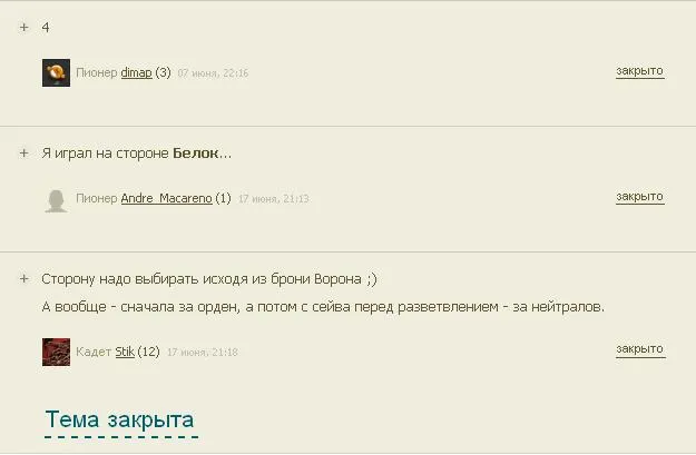 1) Закрыть тему - автор сможет закрыть свой пост, если видит что там начался холивар или флуд. Расход энергии: 500, лимит: 12 уровень. Выглядело б это так, например: