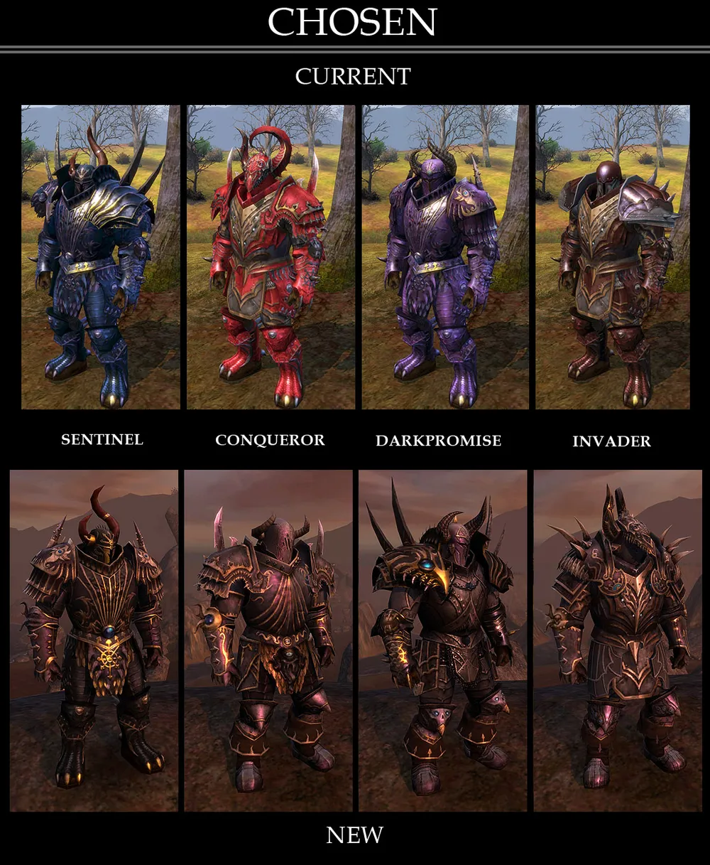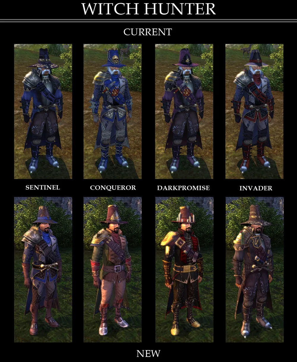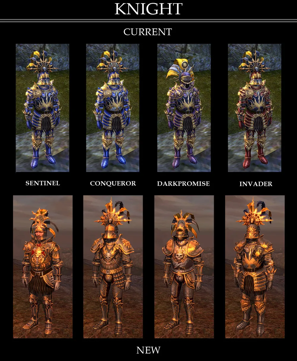 Во второй статье серии «Новый дизайн доспехов» мы рады представить вашему вниманию изменения во внешнем виде доспехов еще восьми карьер. Как и в первой статье, ниже вы найдете изображения «до» и «после» восьми карьер (четыре карьеры Порядка и четыре карьеры Разрушения) в стражницком комплекте доспехов, а также в комплектах Завоевателя, Темного обета и Захватчика.
