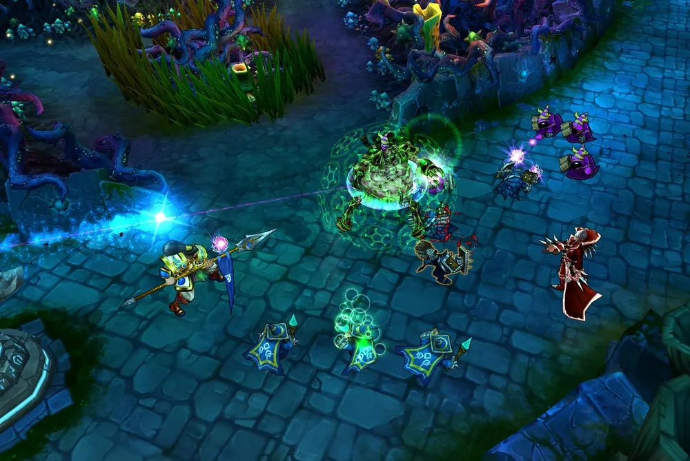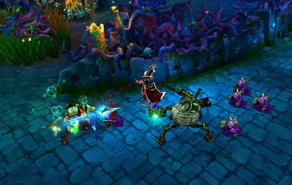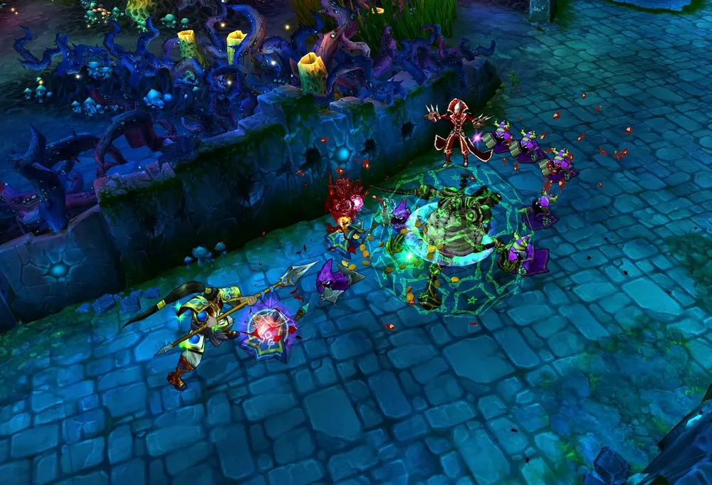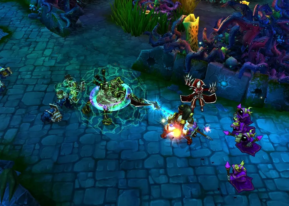 Noxian Corrosive Charge (Заряд Ноксианского Растворителя): Все враги в выбранной области получают магический урон и теряют некоторое количество брони.