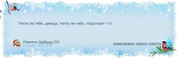Начну, пожалуй, с эмоционального и трогательного: с сего момента все свои поздравлятельные комментарии вы сможете украсить симпатичной новогодней рамочкой с инеем и снегирями.