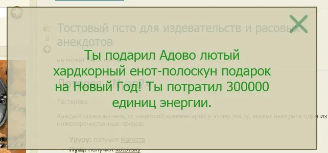 Организационное: прекратите выпрашивать подарки в посторонних постах и личных сообщениях. Наказанием за это будет подарочная импотенция (т.е. лишение подарков).