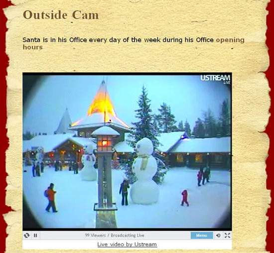 Пожалуй, самое новогоднее место на планете находится в Лапландии, в домике, где проживает любимый детьми Санта Клаус. Здесь всегда лежит снег и чувствуется атмосфера приближающегося праздника. Вот он - самый главный аргумент в пользу существования Деда Мороза - две web-камеры, которые установлены в самом холодном месте планеты. Эти камеры круглосуточно показывают его резиденцию. Одна камера установлена снаружи домика, другая - внутри.
