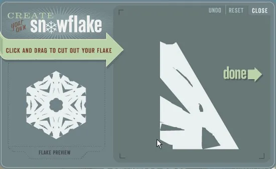 К сожалению, далеко не всегда погода на Новый год радует, и вместо снега за окном идет дождь. А в некоторых широтах снег и вовсе является чем-то невиданным. А между тем, именно снег является неотъемлемой частью зимних праздников и способствует появлению новогоднего настроения. Помните, в детстве мы даже вырезали из бумаги снежинки и клеили их на окна, чтобы казалось, что снег не только снаружи, но и внутри? Примерно тем же самым можно заняться на сайте Snowdays. Тут каждому желающему предлагается создать свою неповторимую снежинку. Для этого достаточно сделать "надрезы" в любых местах сложенного листка бумаги. Создавая снежинку, можно сразу же видеть, какой она будет после того, как "бумагу развернут". Если что-то не получилось, можно вернуться на шаг назад или начать заново.