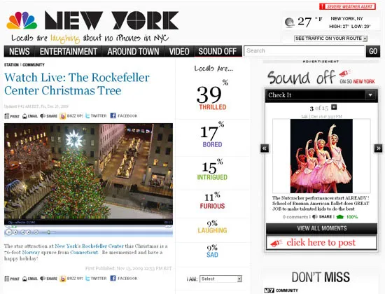 Для большинства американцев рождественская ёлка, расположенная в Нью-Йорке возле здания Рокфеллер-центра, является таким же неотъемлемым атрибутом праздника, как для нас - бой кремлевских курантов на Спасской башне. Поэтому неудивительно, что торжественное зажигание огней на этой ёлке сопровождается огромным представлением с участием таких знаменитостей, как например, Род Стюарт или Шакира. В этом году рождественская ёлка - одно загляденье! Одна верхушка этого дерева, сделанная в виде трехметровой звезды, весит 250 килограммов и украшена стразами Сваровски. Освещается двадцатитрехметровая норвежская ель (кстати, она совсем не из Норвегии, а привезена из штата Коннектикут) гирляндой, состоящей из 30 тысяч энергосберегающих лампочек. Рядом с ёлкой расположен каток, где все желающие могут покататься на коньках. Web-камера показывает картинку в хорошем качестве, видно даже развевающиеся флаги и вспышки фотоаппаратов туристов, приехавших посмотреть на новогоднее чудо.
