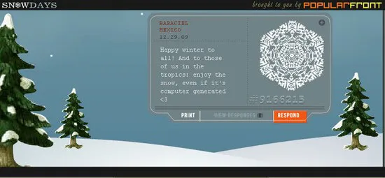 Готовая снежинка будет добавлена к огромной коллекции сервиса, насчитывающей более девяти миллионов экземпляров. При желании ее можно снабдить праздничным сообщением, а также написать свое имя. Если оставить почтовый адрес, то можно получать уведомления о том, что кто-то из посетителей оставил ответное приветствие под сообщением. Кроме этого, снежинку можно послать по почте друзьям.
