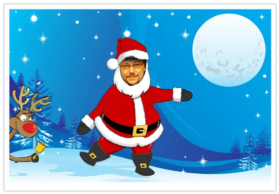 В этом может помочь сайт Santa Yourself. С помощью онлайнового конструктора можно создать флэш-анимацию с пляшущим Санта Клаусом, лицо которого может быть заменено любым портретом. Чтобы Санта принял знакомое обличье, нужно закачать снимок лица на сервер (следует помнить, что размер изображения не должен быть больше 2 мегабайт, а если разрешение по ширине превысит 640 точек, сервис автоматически его отмасштабирует до необходимого размера). Далее, с помощью специальных инструментов, изображение подгоняется под размер головы Санты.