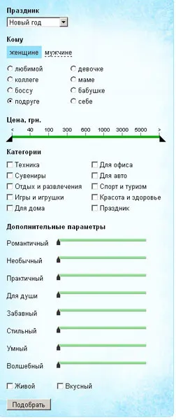 Чтобы воспользоваться сервисом выбора подарков на "Яндекс.Маркете", нужно указать пол человека, которому предназначается подарок, а также обозначить его место в вашей жизни - то ли это просто сослуживец, то ли подарок предназначен родителям, боссу и т.д. Затем с помощью сервиса можно определить диапазон средств, которые вы готовы потратить на презент. Чтобы точно описать подарок, который вы ищете, сервис предлагает выполнить его "настройку" с помощью целой группы параметров, указав различные свойства будущего подарка. Разыскиваемый предмет может быть необычным, практичным, стильным, умным, волшебным, для души, забавным и даже вкусным. Степень присутствия в подарке каждой такой "характеристики" пользователь выбирает сам, при помощи специальных ползунков.