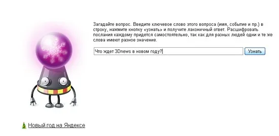 Работает сервис довольно просто: вы задаете вопрос или просто пишете ключевое слово своего вопроса, а сервис генерирует краткий ответ. При этом ответ не всегда понятен сразу. Скорее всего, задавать свои вопросы стоит в новогоднюю ночь, после третьего бокала шампанского. Особенно хорошо, если рядом будут гости, с которыми можно будет провести мозговой штурм на предмет того, что же имела в виду "Яндекс.Гадалка".
