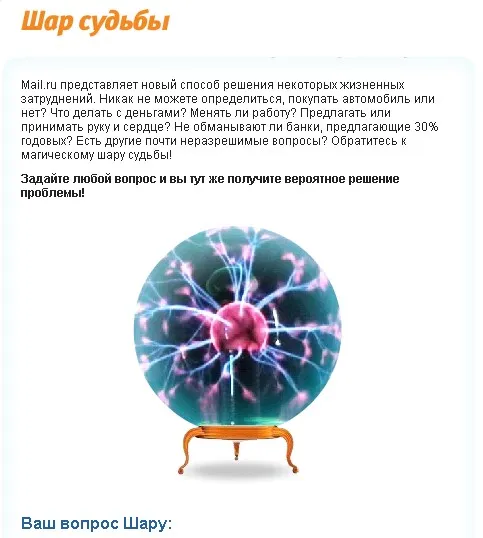 В отличие от похожего "предсказателя судьбы" на "Яндексе", "Шар судьбы" от Mail.Ru более адекватен и ироничен в своих прогнозах. Например, на вопрос относительно денег сервис по-философски отвечает, что денег никогда не бывает много. А на вопрос "Выйду ли я замуж?" отвечает однозначно - "Да!"
