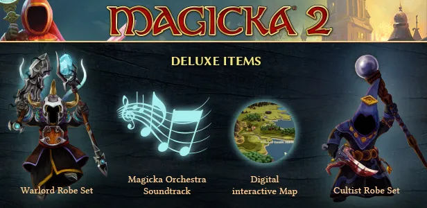 А кроме обыкновенной, можно приобрести Deluxe-версию, в которую входят саундтрек, карта Мидгарда и 2 новые робы: Warlord Robe и Cultist Robe, которая напоминает робу из дополнения к оригинальной Magicka - The Stars Are Left.