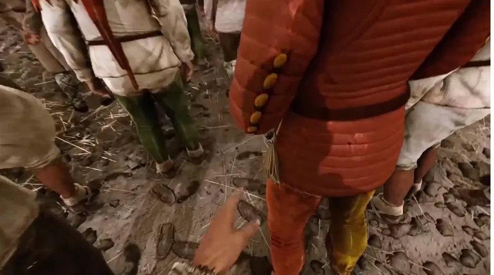 Что меня не мало порадовало это то что персонажей мужского пола одели не в штаны(которые не носились в 14 веке) а в шоссы. Шоссы это такие штанины которые привязывались к трусам(брэ), то есть по середине ничего не было сшито а были лишь брэ. Шоссы это те же самые чулки, только раньше их носили и мужчины и женщины.