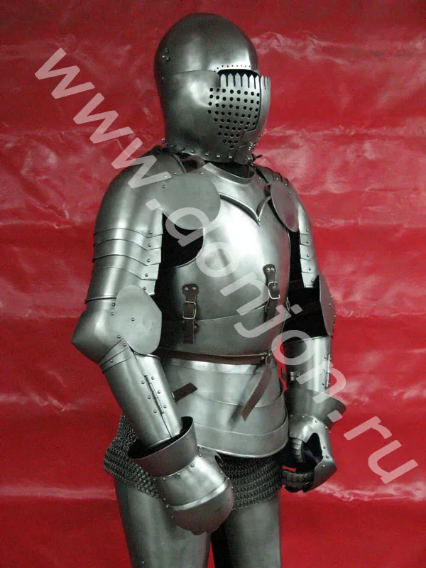1) Бригантная защита бедер, смотрится не аутентично с латным комплексом, т.к. в 15 веке на замену бригантным типам защиты пришли латные.