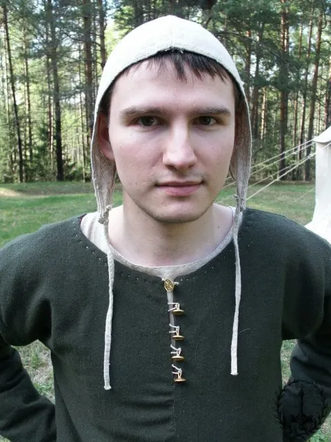 ё) Разноцветный стеганный пурпуэн, цвета обозначают геральдику, на груди нашит герб. Простеганность пурпуэна означает что человек военный, т.к. смысла потеть в толстой одежде кроме того чтобы носить сверху доспехи нет.