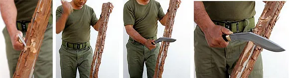 При рубке, для получения лучшего результата, лезвие кукри должно атаковать цель приблизительно под углом в 60 градусов. Делая так, Вы затратите меньшее кол-во усилий. Расстояние кукри от цели должно быть от 30 до 60ти см, для того, что бы можно было легко давать ускорение кукри при кубке. Необходимо выбрать определенную точку и стремиться атаковать именно её. Главная трудность это удержание баланса кукри при рубке, главное избежать прикладывание чрезмерных усилий, т.к. это не увеличит скорости рубки. Ритм, цель и последовательность - вот ключи к эффективной рубке.