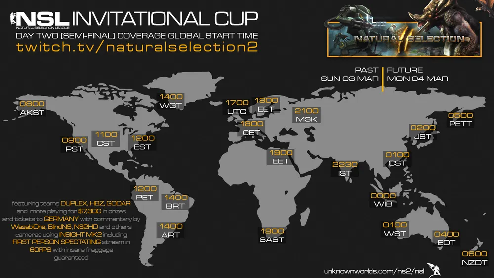 Официальная трансляция продлилась 6 часов, а число зрителей, одновременно смотрящих ее, достигло 1.500. Twitch разместил нас на главной странице, со стабильным числом зрителей, дружелюбным и позитивным чатом. Трансляции сообщества от GohanZeta, Reddog и других проводились даже когда Hugh и Dillon выдыхались от игр на официальной." -NS2 Official Blog