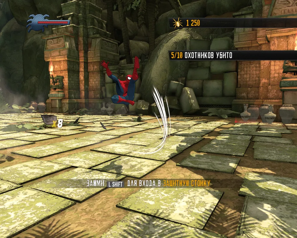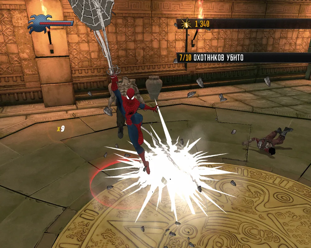 Структура уровня становится очевидна буквально после Крейвена и Твердого Лба (Hammerhead): сначала разработчики дают нам ознакомиться, собственно, с боссом, далее заставят изрядно за ним побегать, после - спасти кучку несчастных бедолаг, дальше предоставят сразиться с толпой подопечных злодея, ну а финал – схватка непосредственно с обладателем одной из частей «Плиты». Она, в свою очередь, тоже поделена на несколько этапов. Отдам должное авторам: почти каждый из боссов уничтожается уникальным образом. Однако проблема в том, что всё, хоть и моментами, но повторяется, и уже на второй час игры (даже раньше) начинаешь обвинять Beenox Studios в самокопировании. Схватка же со Стервятником, которая, по-идее, должна была выйти крайне напряженной и захватывающей, на деле получилась чуть ли не худшей из всех. Таким образом, если в течение первых шестидесяти минут свежий Spider Man увлекает не на шутку, то дальше начинается самый что ни на наесть рутинный геймплей. Скажете, мол, игра рассчитана на один-два уровня в день? Нет, это не оправдание, и за один только этот жирнющий минус (то есть однообразный геймплей) можно присвоить Shattered Dimensions статус очередной неудачной поделки по популярной лицензии.