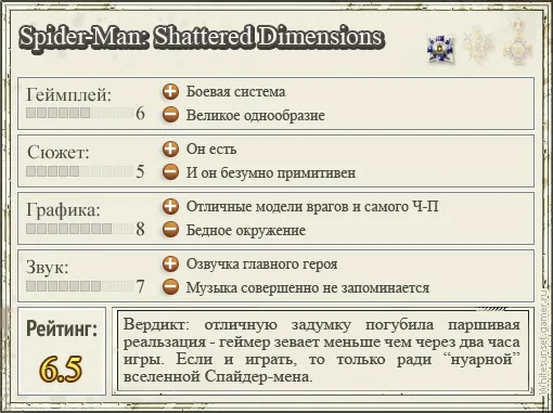 Думая над финальной оценкой, я колебался. С одной стороны, стартует Spider Man: Shattered Dimensions неслабо, увлекая первый час яркими красками, морем врагов и хорошей боевой системой. С другой, игра надоедает уже к середине игры, а мотив для прохождения только один – узнать, кто из супер-злодеев встанет на нашем пути дальше. Прокачка и постоянно открывающиеся костюмы для героя – это, конечно, весомый фактор, но на геймплей он влияет несильно. Озвучка? Она есть, но если голоса разных Пауков местами действительно доставляют (шутками и интонацией), то музыкальное сопровождение просто почти не доходит до ушей. В смысле, что попросту не запоминается. Вот отыграл я два часа, а в голове – полная пустота. А обычно, после прохождения хорошей игры с хорошей музыкой, мой мозг всеми силами пытается напеть запомнившуюся мелодию, пусть это и не всегда получается толково. В общем, рекомендую Beenox Studios, если уж они так любят делать игры про Человека-паука, вплотную заняться отдельной игрой по вселенной Noir. С открытым миром, толковым сценарием и кучей гаджетов для бесшумного устранения противника. В период неоднозначности Splinter Cell – самое оно.