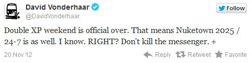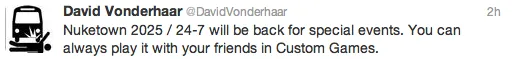 David Vonderhaar ответил в твиттере, что NukeTown 2025 была убрана из плейлиста в связи с окончанием выходных с удвоенным опытом.