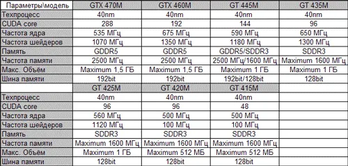 Сводные характеристики мобильных видеокарт NVIDIA Fermi: