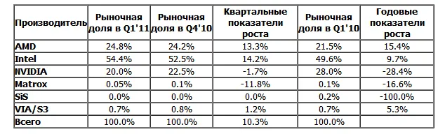 Более 125 миллионов графических чипов поставлено в первом квартале 2011 года. Intel лидирует в количественном выражении благодаря процессорам семейств Clarkdale, Atom и Sandy Bridge.