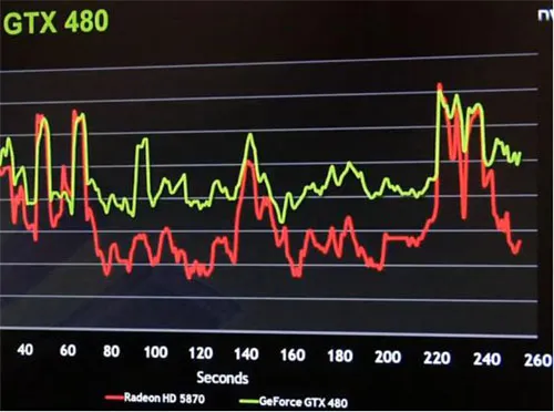 Самое интересное находится чуть левее оратора: график, отображающий число кадров в секунду. Хорошо видно, что Radeon HD 5870 заметно отстает в некоторых сценах от GeForce GTX 480. По словам представителя NVIDIA, наибольший разрыв между конкурирующими решениями наблюдается в сценах с активным использованием технологии тесселяции. Неплохо, верно?