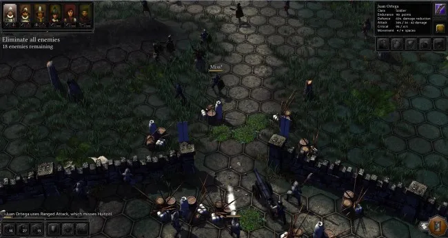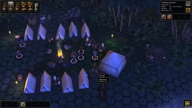 И вот, когда выбор сделан и сказаны все слова, наступает пора сражения. Мы покидаем стратегическую карту, с ее не вполне удобной камерой, и переносимся на тактическое поле, где могут сражаться лишь шесть членов экспедиции. Деление на гексы, напоминает стратегию, вроде Age of Wonders 2: The Wizard’s Throne В целом, бой представлен в классическом ключе, но дополнен ловушками, баррикадами и разнообразными снарядами.