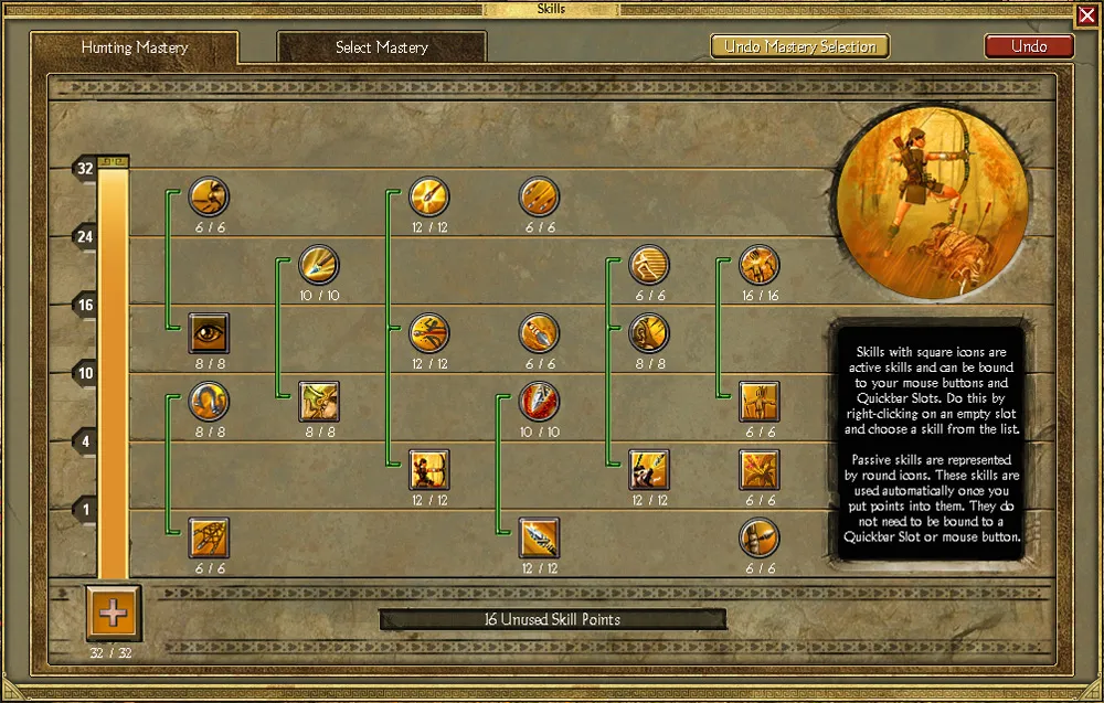 • Искусство охоты [Hunting] – выбор «робингудов»: позволяет ловко управляться с луком (в дальнем бою) и копьем (в ближнем), а также ставить ловушки на манер бойскаута.