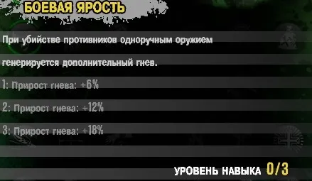 При убийстве оружием, которое вы держите в одной руке, вы получите до 18% гнева дополнительно.