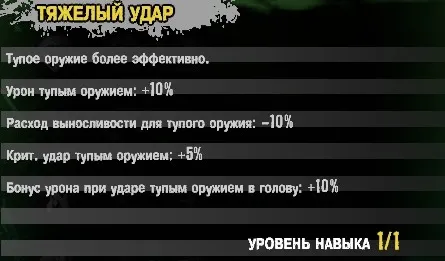 Практически 50% вероятность найти неповрежденное оружие. Неплохой навык, но, опять же, не первостепенной важности.