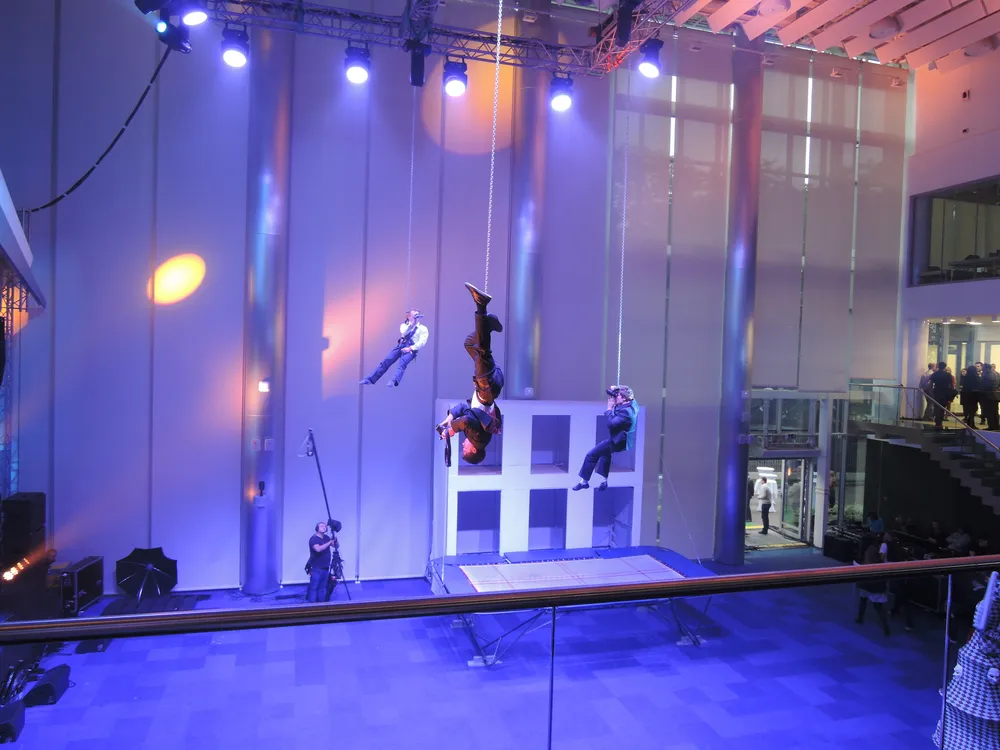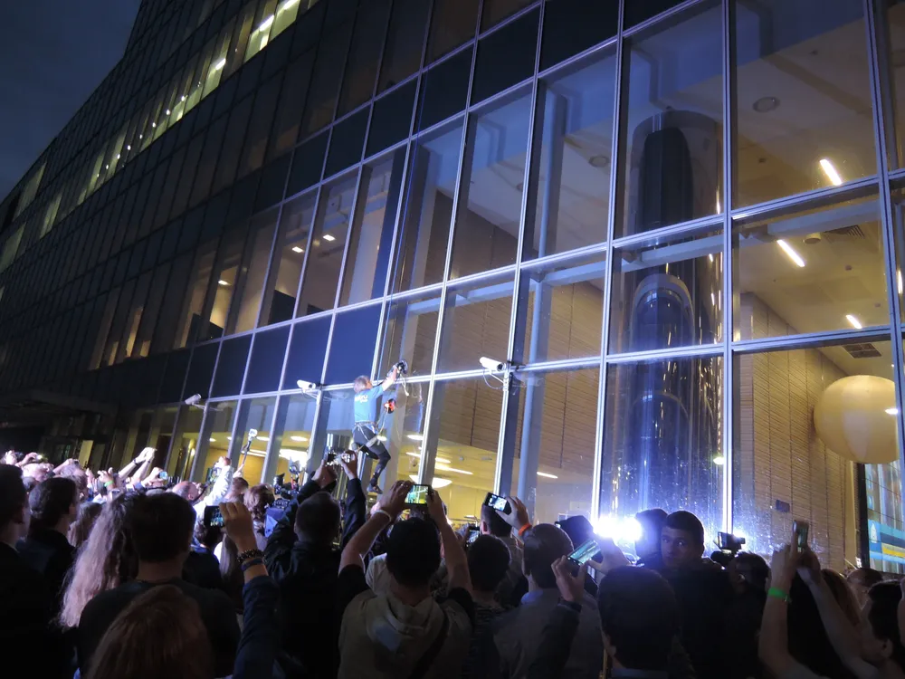 Началось всё с прибытия именитых гостей и экскурсий по интересным этажам здания. Всех желающих превращали в магнитики для холодильника и фотографировали с разгуливающим по второму этажу Вассерманом. Как только началось само действо, некоторых гостей смыло, однако праздник остался на месте. В основном это были выступления, связанные с высотой, такие как выступления батутистов или шоу прямо на стенах со внешней стороны сцены.