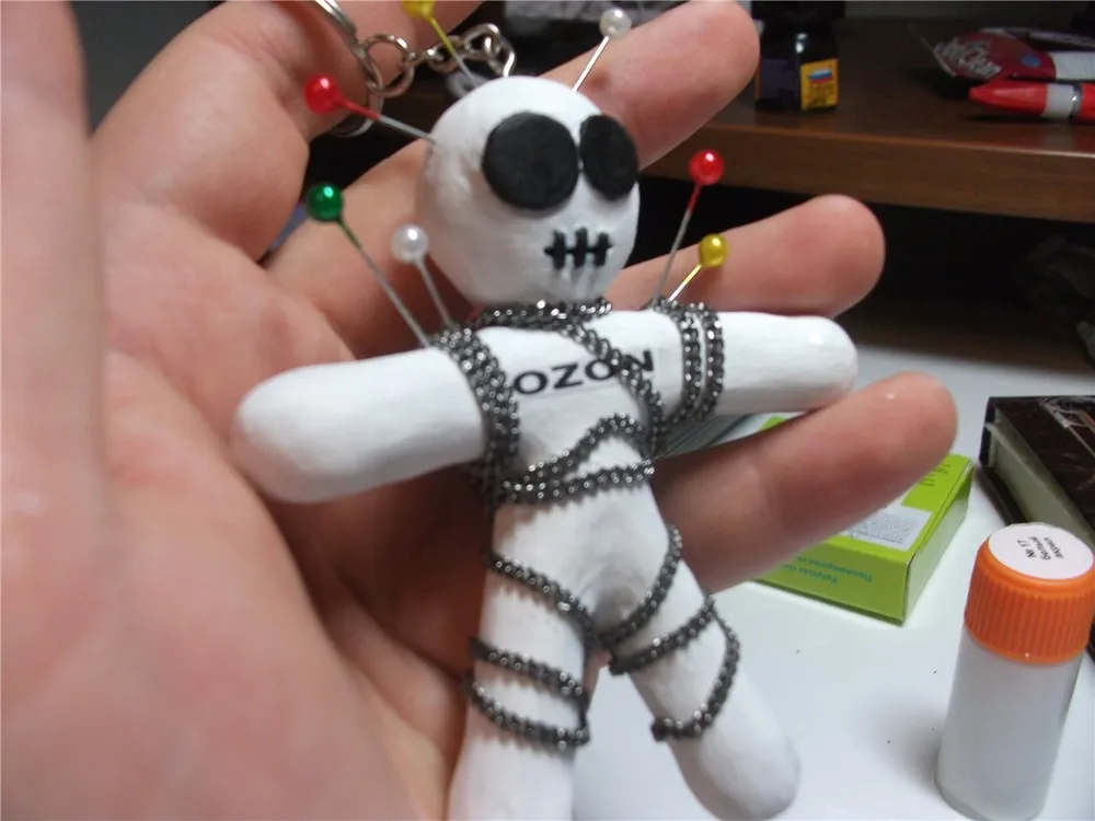 После запекания вкручиваем в голову штифт, делаем дырки для игл, раскрашиваем, наматываем цепочку/верёвку(или чегонеть ещё) и покрываем сверху лаком (да, цепочку тоже лучше покрыть лаком чтоб не болталась и не царапала брелок куклу вуду).