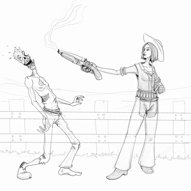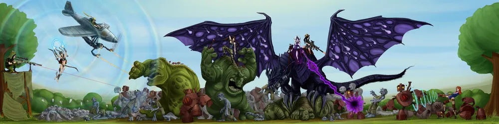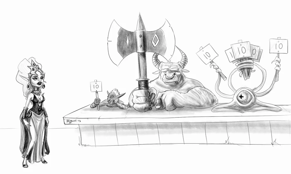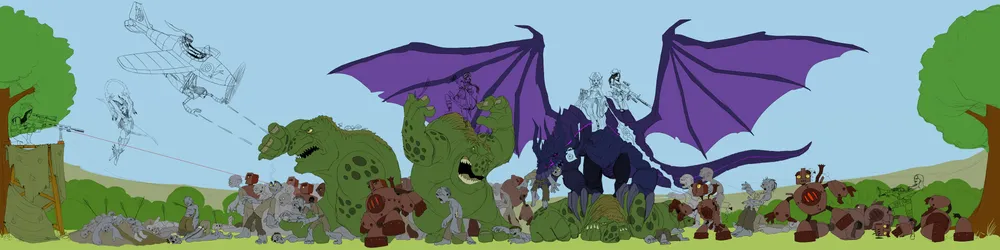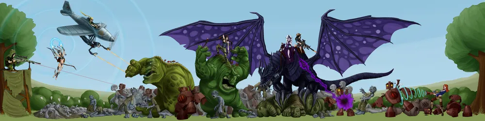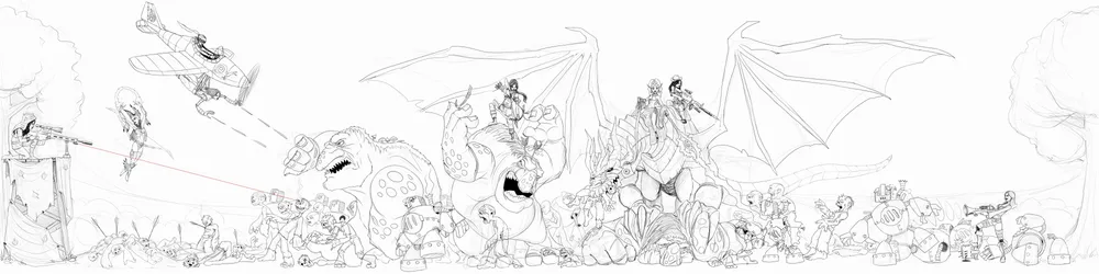 Прежде всего, не хотелось делать некий аналог «общего фото» без сюжета, где все участницы позируют на камеру. Требовалось какое-нибудь действо. При этом желательно, чтобы все дамы оказались вместе, т.к. завершить пусть большую, но одну картинку мне проще, чем множество картинок помельче. Далее. Стравливать девушек между собой мне также показалось плохой затеей. Было бы лучше, если бы они выступали плечом к плечу против какого-нибудь общего врага. Первый универсальный массовый противник, который мне вспомнился и который, кажется, уместен везде и подходит для любых временных рамок, - это зомби. Благо есть и тематическая игра, представленная на конкурсе, и участница, знающая как с ними бороться. Но одних зомби мало, это лишь массовка, нужны противники и посерьезнее. Например, роботы. А точнее, паровые роботы, учитывая стимпанк-составляющую другой игры. Но враг все еще мелковат. Не хватает более внушительных оппонентов. Выбор пал на троллей. И хотя с представленными играми они напрямую вроде бы не связаны (разве что с Героями), но к конкурсу имеют непосредственное отношение. Ибо это форумные тролли (никого конкретно не имею в виду, но если кто-то вдруг захочет побыть прообразом – пожалуйста), и девушки наверняка не отказались бы на них отыграться. Итак, задумка сложилась – орда нечисти, нападающая на красавиц, и красавицы, отстреливающие эту самую орду из положенного им по образу оружия. Все это, по-моему, придумывалось в тот же вечер, когда были выложены фотографии с косплея. И уже перед сном, за пару минут сделал грубый набросок, просто чтобы не забыть. Получилось это так:
