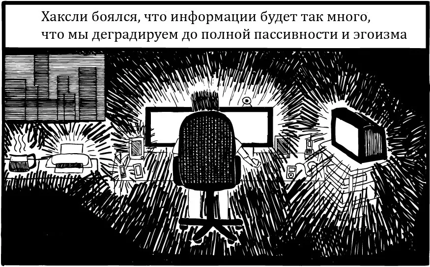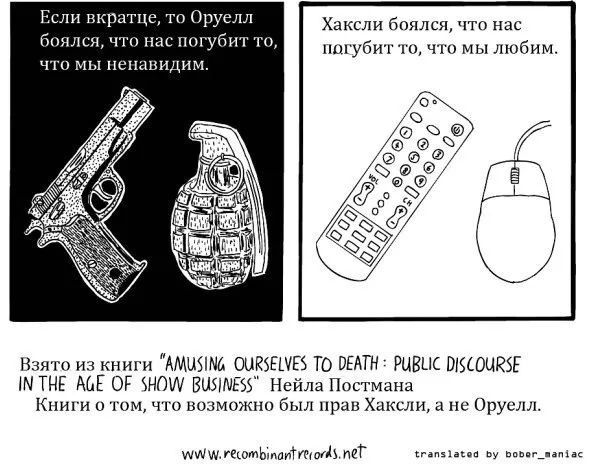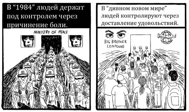 Общество Хаксли регулярно употребляет наркотик счастья, в то время как умы и история общества Оруэлла постоянно корректируется в угоду государству.