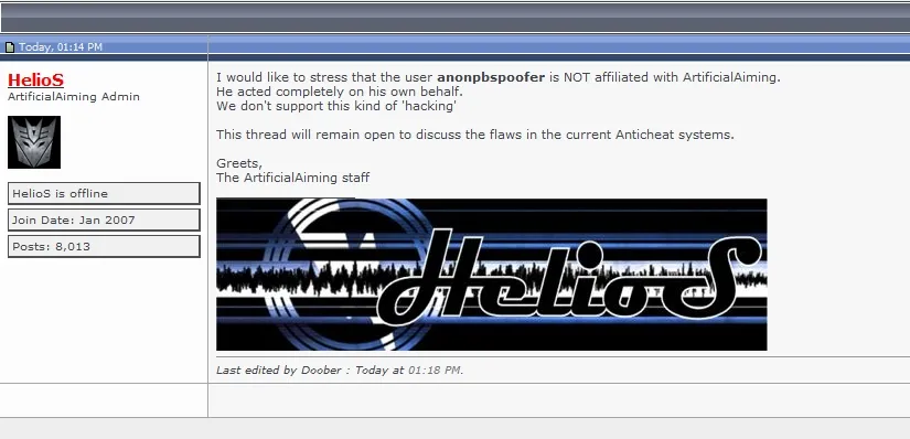 Я хочу подчеркнуть это: ArtificialAiming– это не «хакерская группировка», как сказал автор предыдущего поста. Это самый обычный сайт, продающий приватные (платные) читы для сетевых игр. Они не занимаются взломами и не поддерживают их, о чем, кстати, написано и на Котаку.