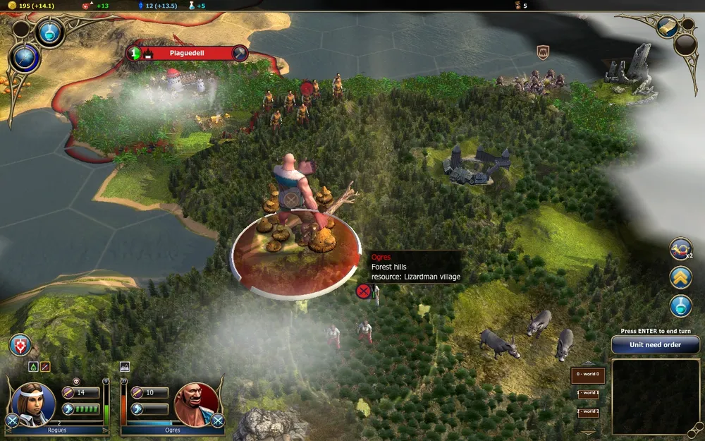 Надо сказать, Warlock чертовски похожа на Civilization V — не только наличием «гексов» (шестиугольных ячеек карты), но и меню (наверняка, у похожести есть какое-то рациональное объяснение). Ужасно неохота выступать в жанре «превью по скриншотам», но… придется. Дело в том, что на шотах видно прокрутку миров (World 0, World 1, World 2 — хотя, возможно, это редактор), что вызывает в памяти Master of Magic, и полуразрушенные башни (в MoM такие использовались для перехода между мирами Арканус и Миррор). И раса Lizardmen здесь. Вау? Впрочем, тактических битв что-то не видно. Буу.