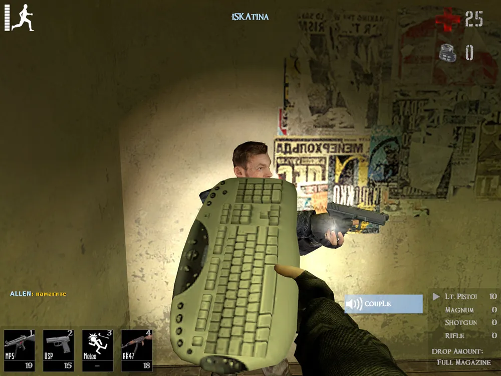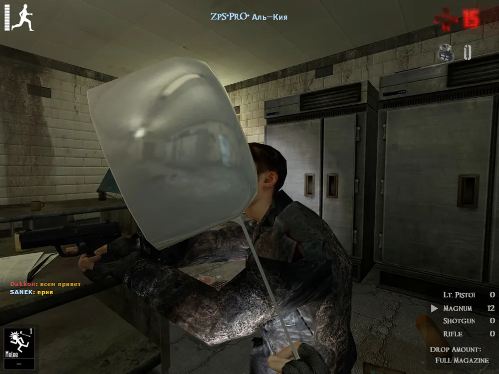 При каждом ударе есть некоторая вероятность, что человек заболеет. Поначалу он будет кашлять, потом вместо индикатора здоровья появится несколько остроконечных точек, и finita la comedia — превращение в мертвеца. Случится это неприятное событие через минуту. Особенно приятно, когда зомби появляется в забаррикадированной комнате и за счет фактора внезапности пожирает всех присутствующих. Вероятность заражения определяется параметрами сервера, например — «65% infection» означает, что заболеть можно с 65%-ной вероятностью. Если вы кого-то заразили или видите зараженного, рекомендуется его не трогать — он помрет сам, а если повезет — закусает еще кого-нибудь.