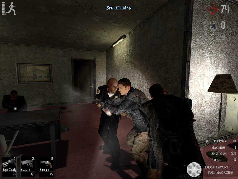 Кстати, некоторые игроки полагают, что могут отсидеться в темном уголке и зомби их не найдут. Однако разработчики предусмотрели остроумную защиту от такого поведения — оставаясь один, человек начинает весьма громко разговаривать сам с собой, а со временем станет делать это практически непрерывно. Как вы понимаете, найти его при этом гораздо легче. С другой стороны — карта может быть большой. В общем, баланс соблюден.