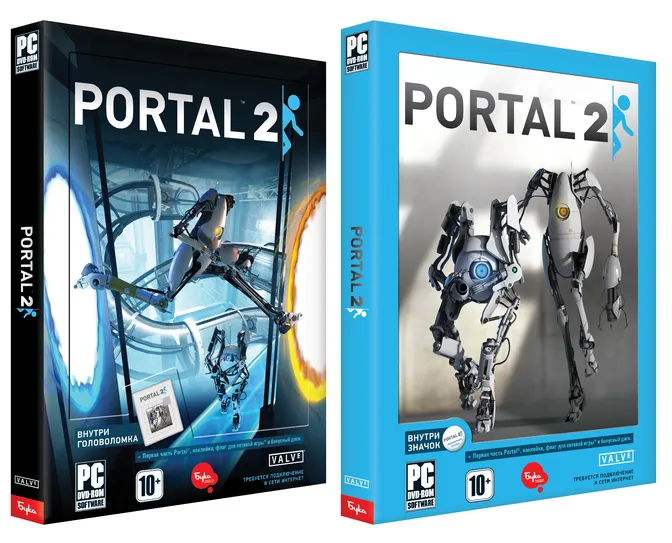 Игра издаётся в двух вариантах - тёмном и светлом. В тёмном варианте помимо кодов активации для Portal 2, Portal и скинов роботов также будут: стерео (3D) вставка (вставка является обложкой DVD-box´а, однако её можно вытащить и приклеить к чему-нибудь, например к холодильнику), головоломка и наклейки (3шт). В светлом же издании помимо кодов активации будут: варио-вставка (аналогичная стерео-вставке), значок диаметром 78 мм и наклейки (3шт). Как выглядят вставки, головоломка, значок и наклейки, Вы можете увидеть на картинках, что мы выложили.