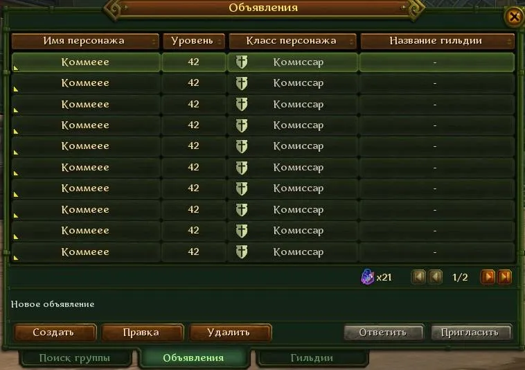 • Появился новый интерфейс - Доска Объявлений. Активировать его можно в окне Общение, расположенном в правой нижней панели управления интерфейсом. Воспользоваться сервисом смогут игроки, завершившие стартовое приключение. Объявления сгруппированы по типам. В отдельной закладке «Поиск группы» будет возможно создать бесплатное объявление о поиске компании для прохождения приключений. Для игрока отображаются объявления других игроков, отличающихся по уровню не более чем на два от уровня персонажа. В закладке «Объявления» вы можете разместить любые объявления, но для этого вам понадобятся специальные Чернила. А в закладке «Гильдии» глава гильдии и ее офицеры смогут публиковать объявления для своей гильдии, что также потребует Чернила.