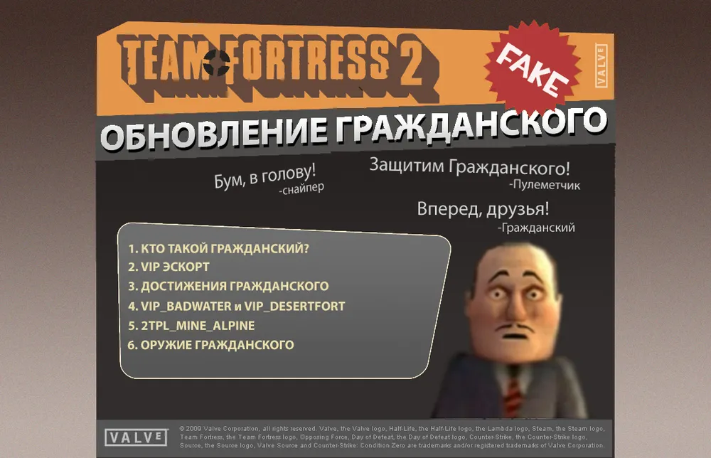 Так вырезан этот гражданский из видео снайпера прикольно=))Fake тоже раньше писали, только маленьким шрифтом внизу около значка Valve, на одном из фейков точно видел=)