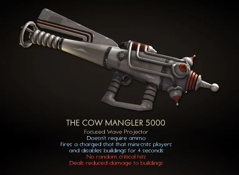 Уничтожитель коров 5000 заменяет ракетомет солдата и не требует патронов. Он попросту стреляет концентрированным энергетическим лучом, который поджигает жертву и рядом стоящих врагов (это мы точно о TF2 говорим?), а заряженный заряд мини-критует и отключает постройки аж на 4 секунды. Правда вот заряжается луч около 3 секунд, и при этом солдат передвигается чуть быстрее пулеметчика. идет Из минусов: никаких критов, пониженный урон постройкам.