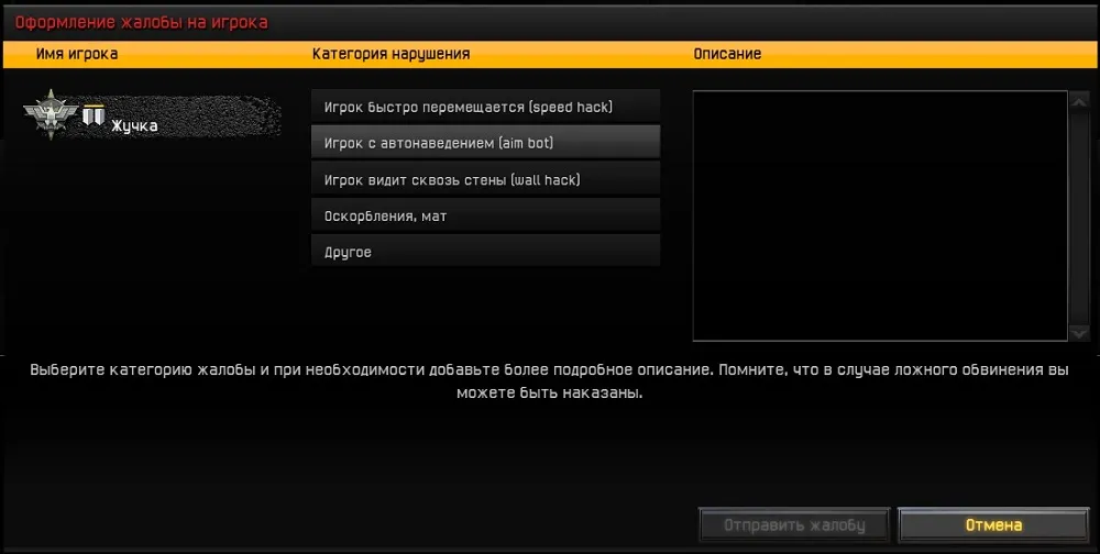 • Обращаем ваше внимание, что система жалоб не является средством мгновенной блокировки игрока, а служит для более удобного и быстрого сообщения о нарушениях, которые позже рассматриваются специалистами. Она находится в разработке и в будущем может изменяться. Мы не рекомендуем вам пытаться злоупотреблять возможностью жалоб и напоминаем, что намеренное введение администрации в заблуждение также является нарушением правил игры.