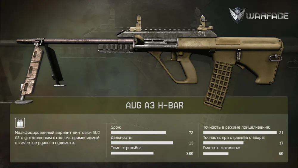 AUG A3 Hbar - винтовка штурмовика, модифицированная для использования в качестве ручного пулемета. Продается за кредиты.