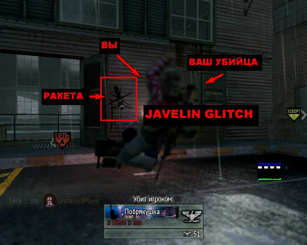 Суть бага заключалась в следующем: если выбрать Javelin, а потом переключится на пластид, и не отпуская G, снова выбрать Javelin, то в момент вашей смерти ракета вылетит и уничтожит все в радиусе 20-30 юнитов. Впрочем, данный трюк можно было проделать даже с РПГ и Стингером, но зона поражения у них была гораздо меньше. Впервые об этом баге стало известно на xbox, а потом кто-то проверил и оказалось, что он также имеет место и в PC-версии. Серверы заполонили нубы-суицидники, которые забыв про любимый подствольный гранатомет, сияя от счастья неслись в толпу врагов.